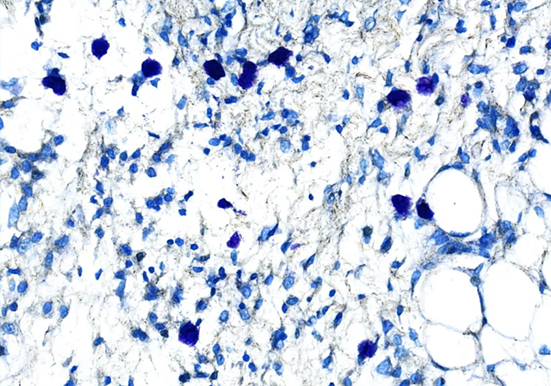 染色结果:肥大细胞颗粒呈紫红色,细胞核呈蓝色。