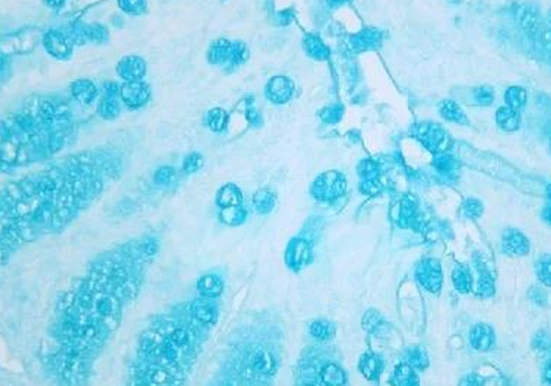 阿利新蓝是一种阳离子染料,分子结构中的异硫脲基具有中度碱性,使得染料带阳离子。组织内的酸性粘液物质含有阴离子基团,如羧基和硫酸根,阿利新蓝可与这些阴离子基团形成不溶性复合物,从而使酸性粘液物质染成蓝色。通过调整染液的 pH 值,可以区分不同类型的酸性粘液物质,如在 pH2.5 时,组织内的羧基电离,与阿利新蓝中的阳离子形成盐键,使带有羧基的组织(如蛋白多糖、透明质酸以及上皮酸性黏蛋白)染色;在 pH1.0 时,组织内的硫酸根电离,与阿利新蓝中的阳离子形成盐键,使带有硫酸根的组织(如硫酸黏液物质)染色。